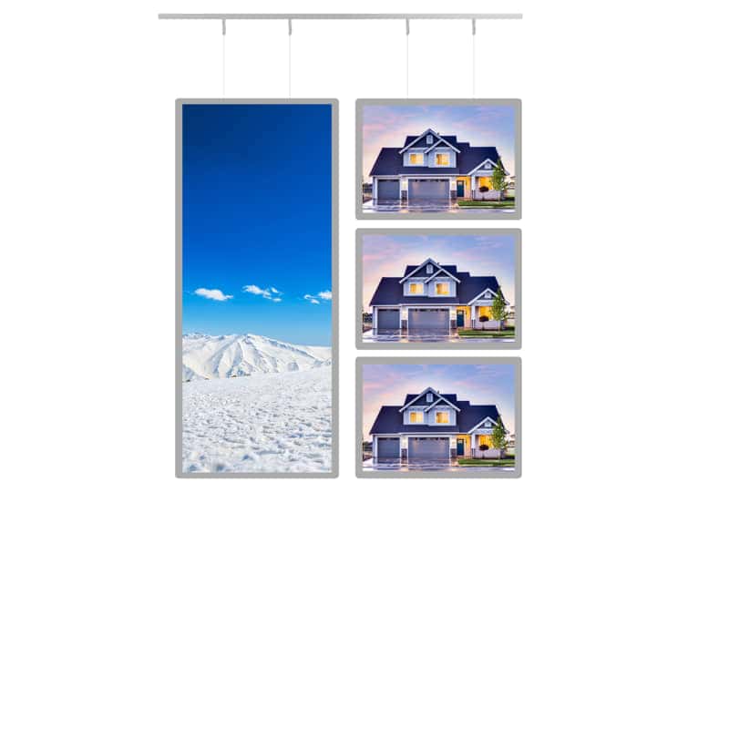 Étape 3 – Accrochez un premier porte affiche aux câbles. Connectez l’alimentation au rail. Branchez-la pour vous assurer que les écrans s’allument.